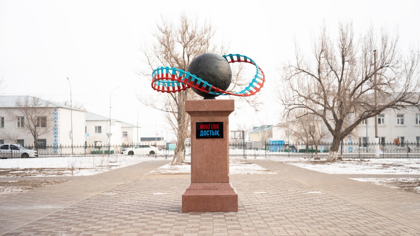 Жер шары бейнеленген композицияны айнала орналасқан теміржол желісі «Мебиус лентасы – шексіздік лентасы» – қағидаты бойынша жасалып, халықтар мен мемлекеттер арасындағы сауда-экономикалық байланыстардың шексіздігін білдіреді. Қазақстан мен Қытай туларының түстерімен әрленген рельстер әлемдік сауда мен логистикадағы сауда стратегиясы мен серіктестіктің символын білдіреді.