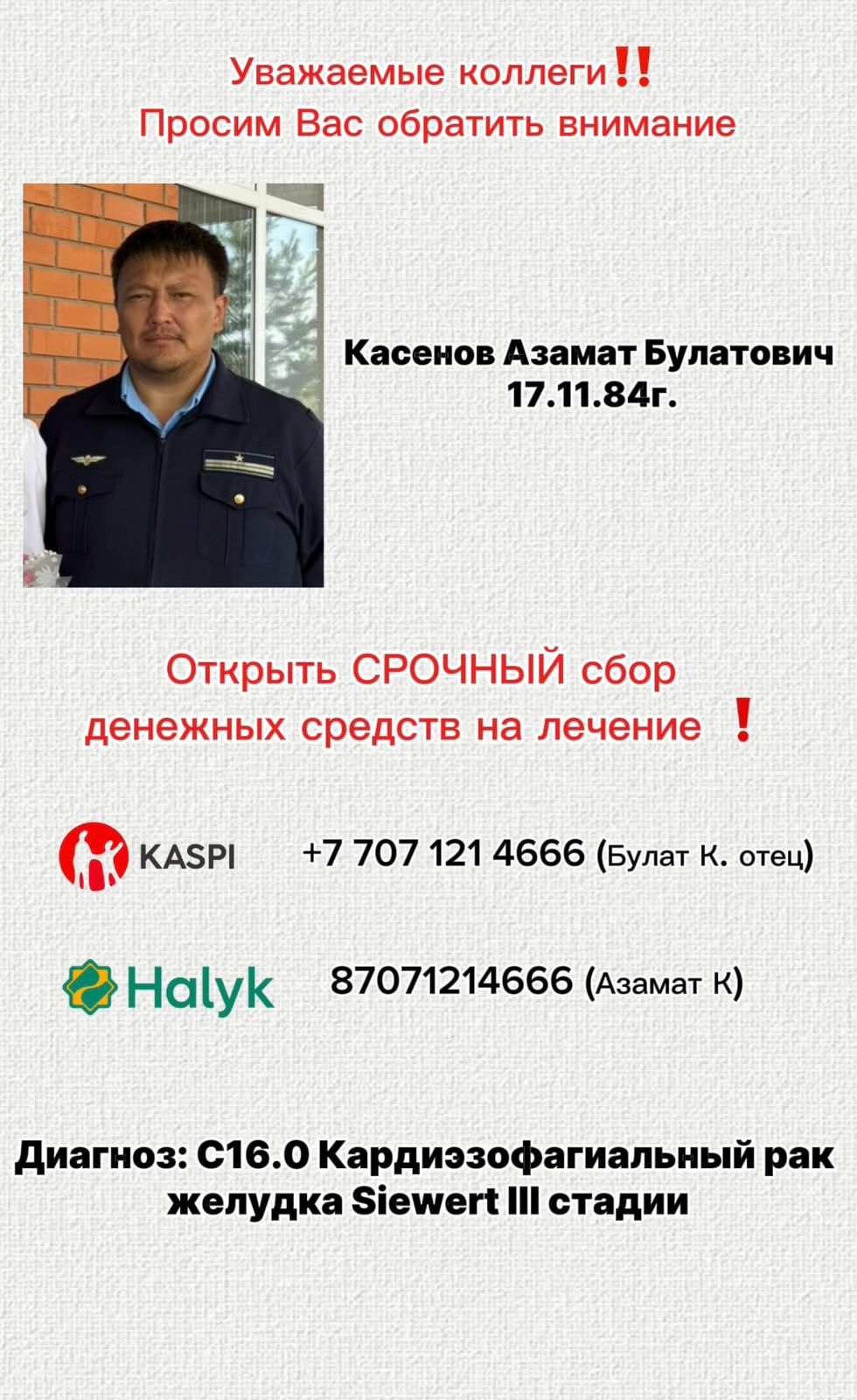Семья начальника производственно-технического отдела Курорт-Боровского эксплуатационного локомотивного депо (ТЧЭ-10) Азамата Касенова оказалась в тяжелой жизненной ситуации. В июле 2025 года ему был поставлен диагноз «С16.0 Кардиэзофагиальный рак желудка Siewert III стадии».