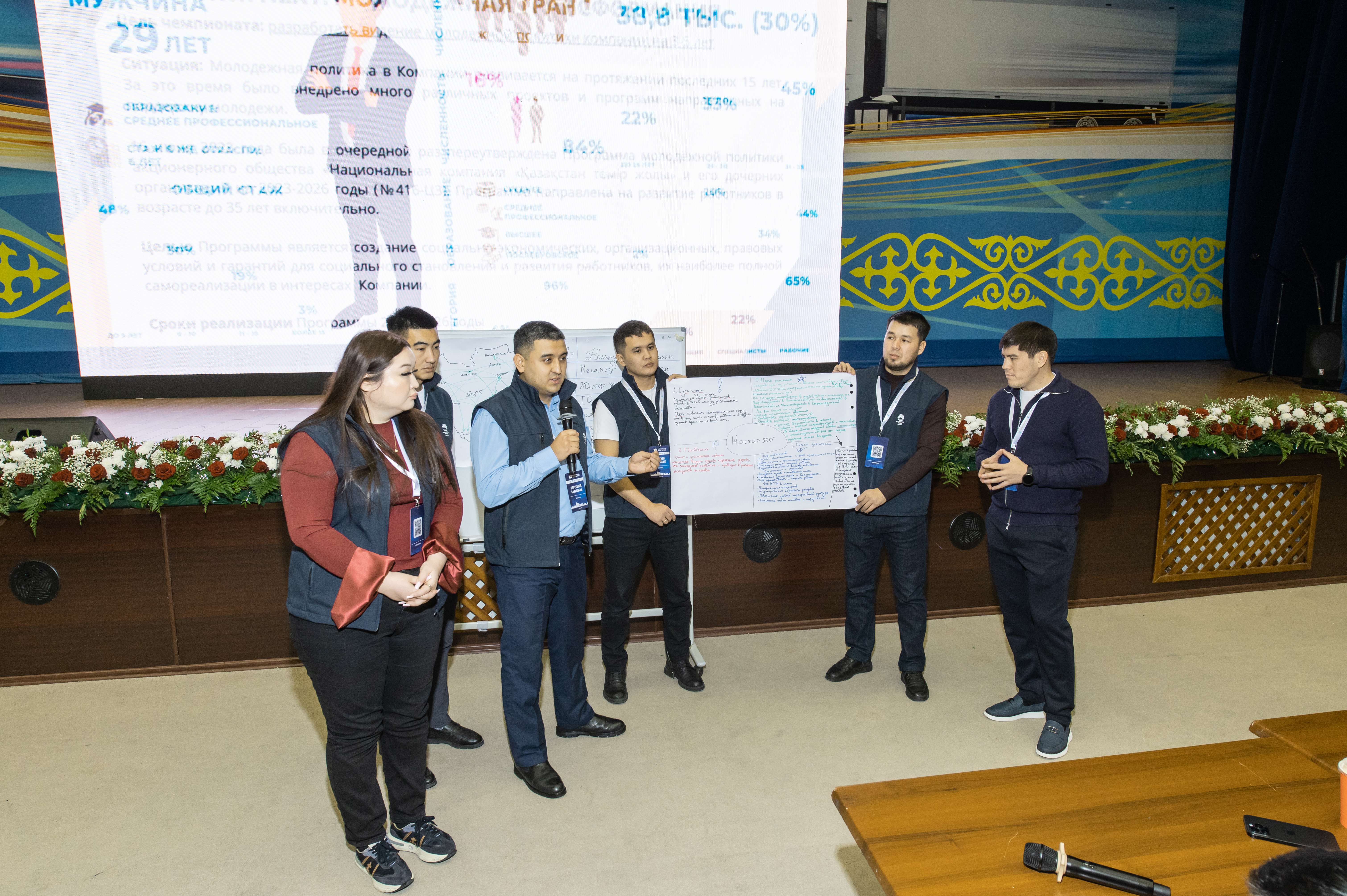 Озвучив задание, организаторы предоставили участникам обобщенный портрет молодого работника ҚТЖ. Это мужчина 29 лет со средним специальным образованием и стажем в отрасли 6 лет.