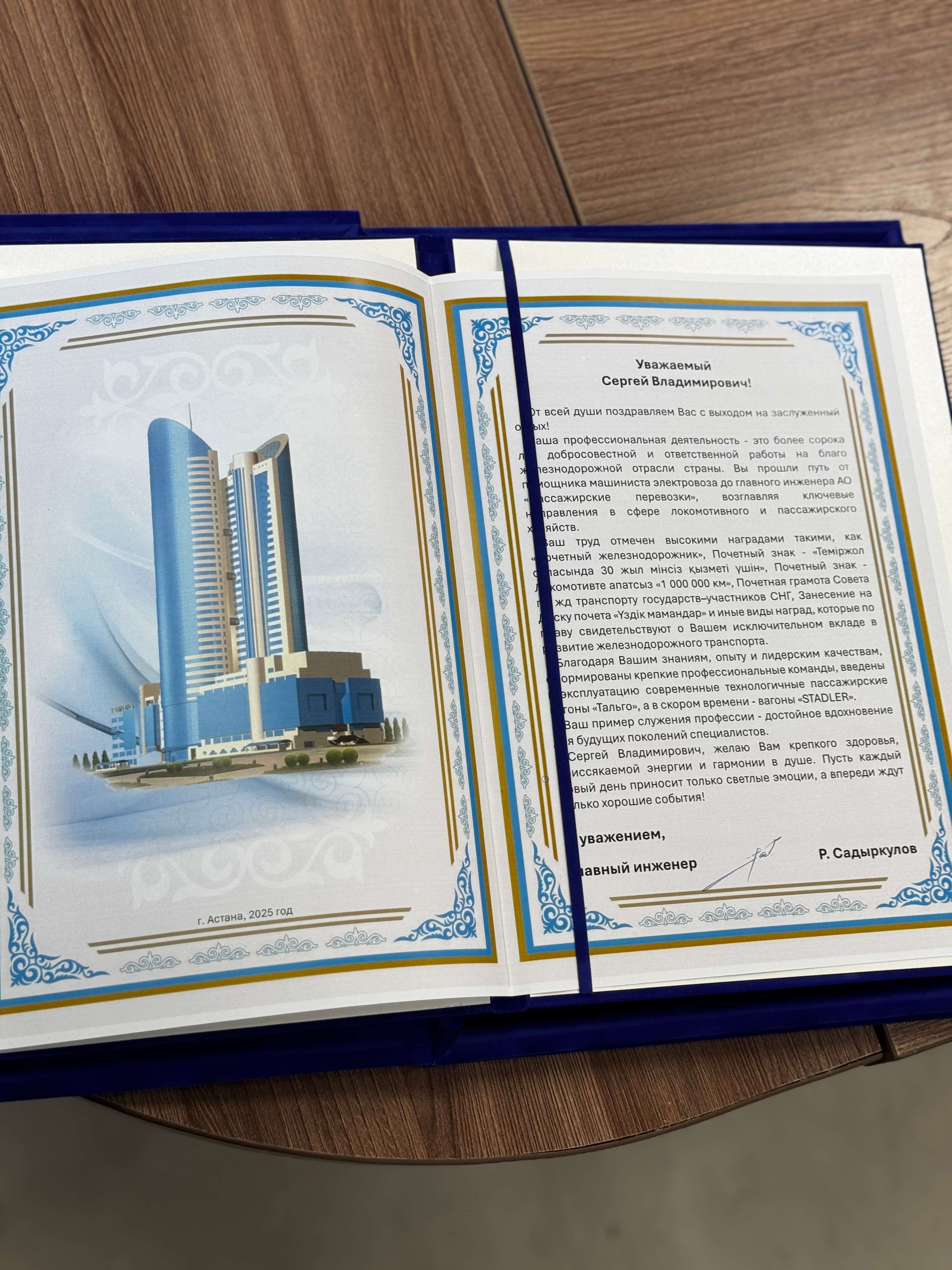В Астане проводили на заслуженный отдых главного инженера АО «Пассажирские перевозки», почетного железнодорожника Сергея Балашова, посвятившего более 40 лет работе в отрасли.