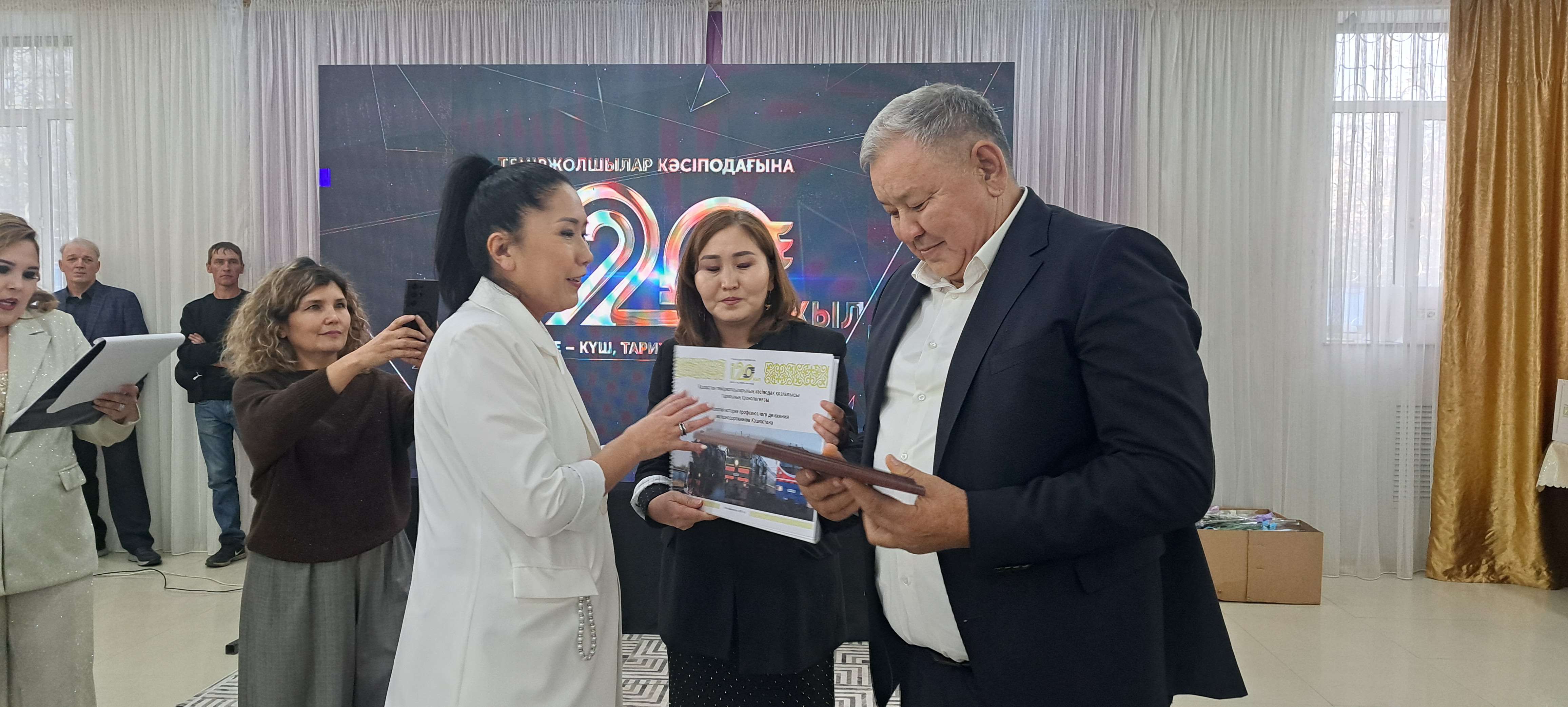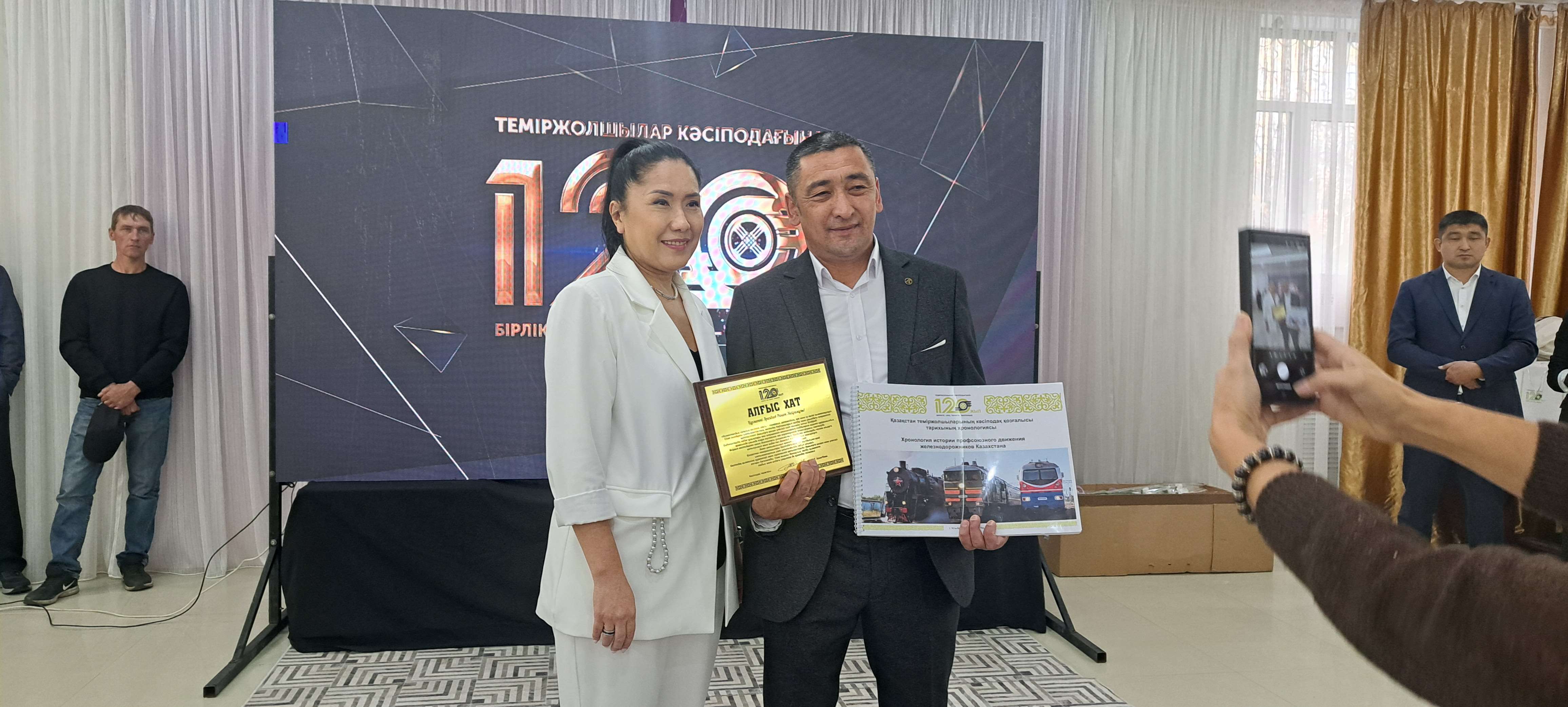 Благодарственные письма от председателя ОО «Казпрофтранс» Оразгали Ахметбаева вручили всем руководителям железнодорожных предприятий. Председатель цехкома Оскеменского эксплуатационного вагонного депо Шалкар Калмакпаев получил почетную грамоту председателя Федерации профсоюзов РК. За активное участие в решении вопросов, направленных на социальную защиту членов профсоюза, более двух десятков железнодорожников получили юбилейные медали в честь 120-летия профсоюзного движения. Среди них – председатель Совета ветеранов железнодорожников Восточно-Казахстанского региона Кусайын Кожахметов, бывший представитель Центрального совета ОО «Казпрофтранс» по Защитинскому узлу Валерий Сидельников, пенсионеры, руководители предприятий, представители ИТР, а также рядовые работники. Почетными грамотами и благодарственными письмами председателя ОО «Казпрофтранс» наградили около 60 железнодорожников.
